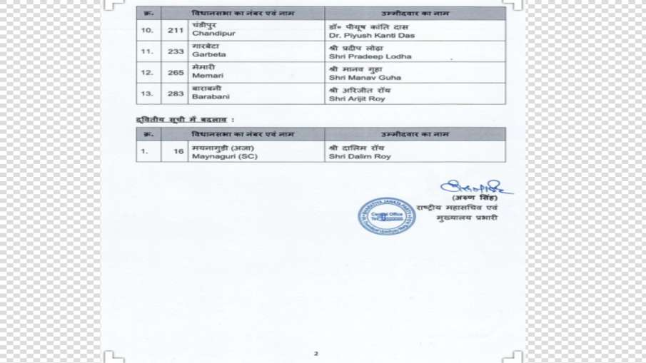 नई सूची के अनुसार, सिताई से आशुतोष वर्मा, नाटाबाड़ी से गिरिजा शंकर रॉय, बागदा से सोमा ठाकुर, मगराहाट पूर्व से उत्तम कुमार बनिक और फाल्टा से देबांगशु पांडा को उम्मीदवार बनाया गया है. इसके अलावा सोनारपुर उत्तर से देबाशीष पाठक, हावड़ा दक्षिण से श्यामल हाती, पंचला से रंजन कुमार पॉल, चंडीपुर से पीयूष कांति दास, गारबेटा से प्रदीप लोढ़ा, मेमारी से मानव गुहा और बाराबनी से अरिजीत रॉय को मैदान में उतारा गया है.