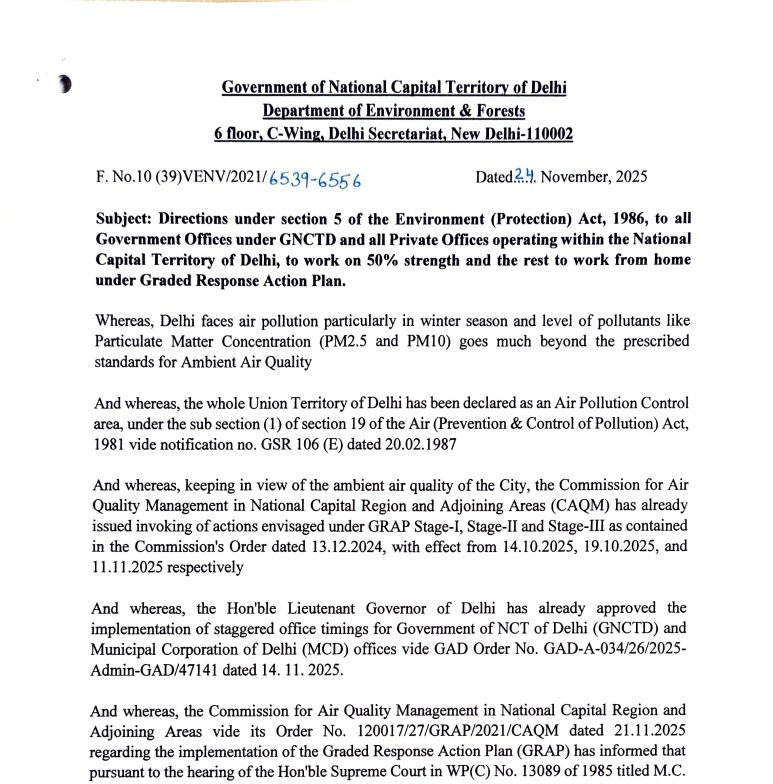 बीते कई दिनों से दिल्ली की हवा बेहद खराब स्तर पर है। जिस कारण वाहनों से होने वाले, व फैक्ट्रीयों से निकलने वाले धुएं से प्रदूषण को कम करने के लिए दफ्तरों में उपस्थिति घटाना जरूरी माना गया है। यह निर्णय GRAP स्टेज-3 के तहत लिया गया है, ताकी वायु प्रदुषण को कंट्रोल कर सकें।