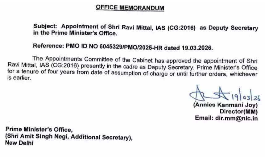 कार्मिक एवं प्रशिक्षण विभाग के ऑफिस मेमोरेंडम के अनुसार, कैबिनेट की नियुक्ति समिति (ACC) ने डॉ. रवि मित्तल की पीएमओ में उप सचिव के पद पर तैनाती को मंजूरी दी है। आदेश में सभी संबंधित विभागों और अधिकारियों को इसकी जानकारी भी भेज दी गई है।