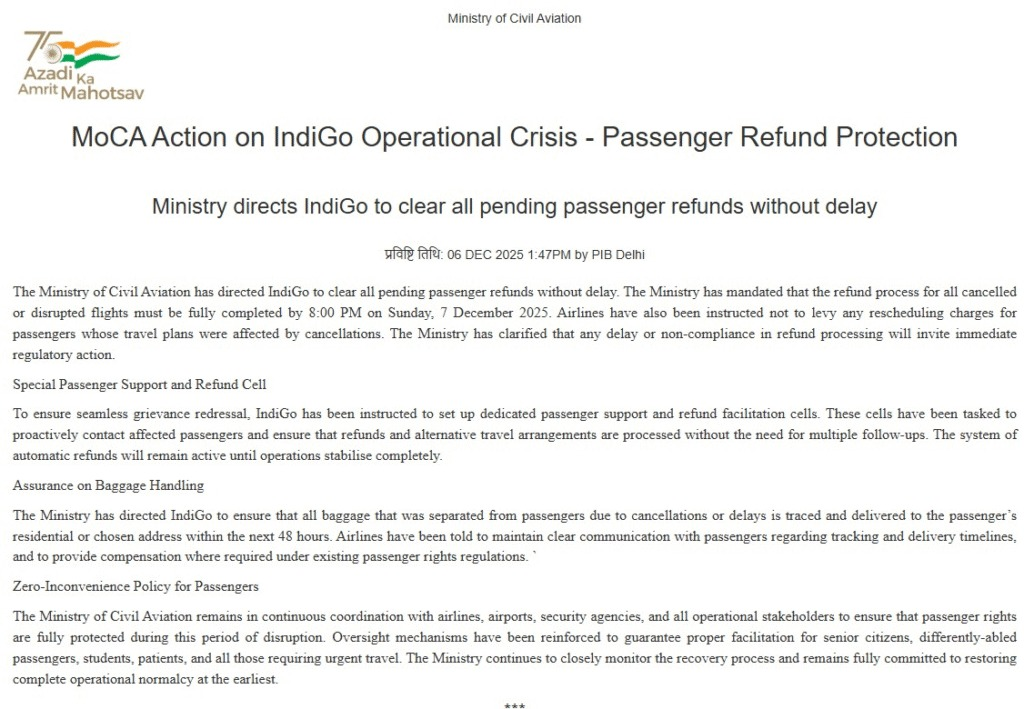 IndiGo Flights Crisis : देश की सबसे बड़ी इंडिगो एयरलाइन को लेकर बड़ी जानकारी सामने आई है। बीते दिनों से इंडिगो की ज्यादातर फ्लाइट्स रद्द व देरी से चल रही हैं। जिसको लेकर अब सरकार एक्शन मोड में है। यात्रियों को हो रही परेशानियों पर सरकार ने इंडिगो को पैसा रिफंड करने के निर्देश दिए है।