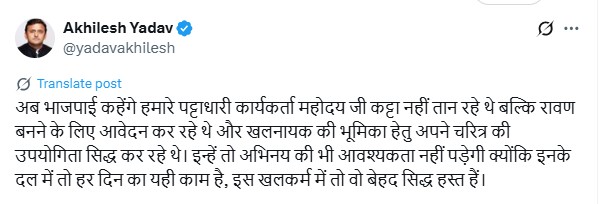 कानपुर की घटना को लेकर अखिलेश यादव ने एक्स पर लिखा, “अब भाजपाई कहेंगे हमारे पट्टाधारी कार्यकर्ता महोदय जी कट्टा नहीं तान रहे थे, बल्कि रावण बनने के लिए आवेदन कर रहे थे, बल्कि रावण का रोल पाने के लिए ऑडिशन दे रहे थे. खलनायक की भूमिका के लिए अपने चरित्र की उपयोगिता सिद्ध कर रहे थे. इन्हें तो अभिनय की भी आवश्यकता नहीं पड़ेगी क्योंकि इनके दल में तो हर दिन का यही काम है, इस खलकर्म में तो वो बेहद सिद्ध हस्त हैं.