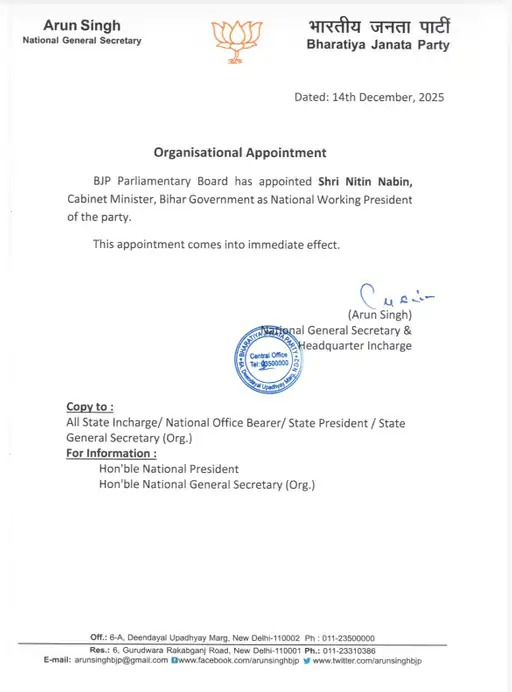 बीजेपी के राष्ट्रीय महासचिव की ओर से जारी लेटर में कहा गया है, ‘भारतीय जनता पार्टी के संसदीय बोर्ड ने बिहार सरकार में मंत्री नितिन नबीन को बीजेपी का राष्ट्रीय कार्यकारी अध्यक्ष नियुक्त किया है। उपरोक्त नियुक्ति तत्काल प्रभाव से लागू होगी।