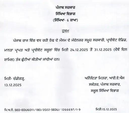 School Holidays : पंजाब सरकार ने कड़ाके की ठंड और घने कोहरे को देखते हुए स्कूलों में छुट्टियों का ऐलान किया है। यह छुट्टियां 24 दिसंबर से 31 दिसंबर तक रहेंगी। पंजाब के सरकारी, प्राइवेट एडिड, मान्यता प्राप्त और निजी स्कूल इस अवधि के दौरान बंद रहेंगे।